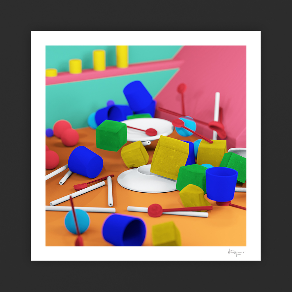 The perception of colours, shapes and how they interact with space, the surreal representation of reality filtered through the undefined senses; how, even in simplicity, a child's mind can often create a dreamlike dimension, almost detached from the object's function, from what it was designed for. A series of video and printed works in which the viewer is immersed in a surreal world, defined by animated 3D elements that interact with each other, artistically interpreting what a child might perceive and process.