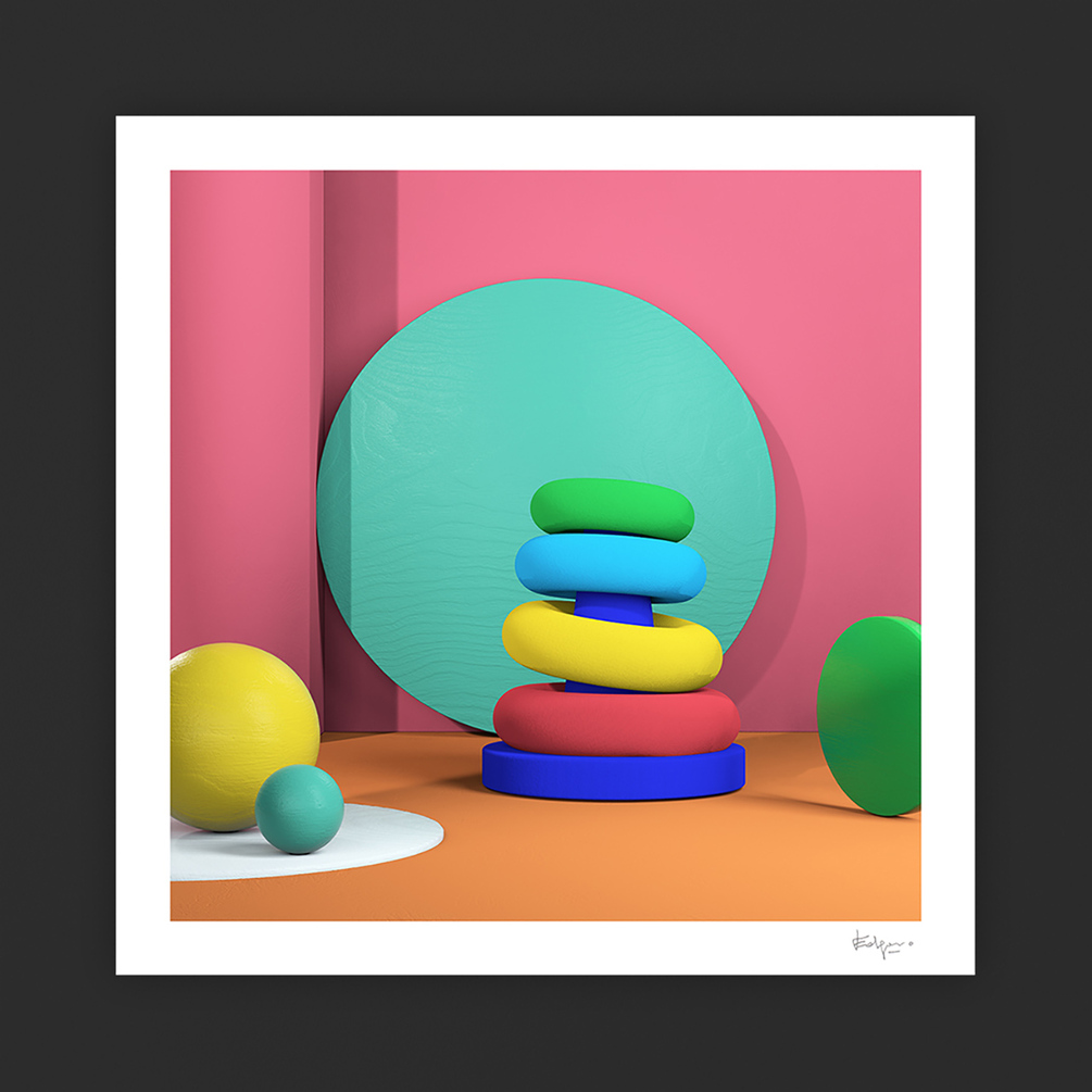 The perception of colours, shapes and how they interact with space, the surreal representation of reality filtered through the undefined senses; how, even in simplicity, a child's mind can often create a dreamlike dimension, almost detached from the object's function, from what it was designed for. A series of video and printed works in which the viewer is immersed in a surreal world, defined by animated 3D elements that interact with each other, artistically interpreting what a child might perceive and process.